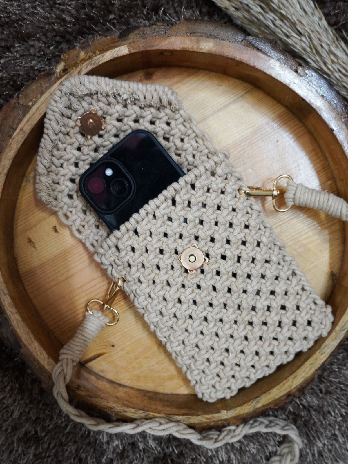 Handcrafted with products cords, this sleek macram? crossbody is designed to carry your phone and small essentials with ease. Featuring a magnetic closure and a subtle logo accent, it?s a simple yet stylish accessory for?everyday?wear.
