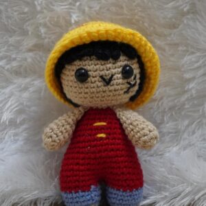 Hand crocheted with products yarn, this doll is dressed in a red outfit and signature yellow straw hat capturing the playful spirit of a pirate adventurer. Safe, lightweight, and made with care, it makes a perfect gift for anime fans, kids, or anyone who loves unique handmade collectibles.